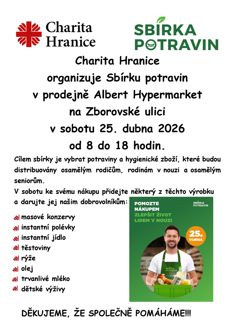 Jarní kolo tradiční Sbírky potravin proběhne v sobotu 25. dubna 2026. V Hranicích Sbírku potravin společně pořádají Potravinová banka a Charita Hranice. Sbírka se uskuteční od 8 do 18 hodin v hypermarketu Albert na Zborovské ulici.